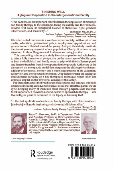 Offers therapists guidance in helping multigenerational families with older members understand and cope with the myriad challenges they face. The text considers such issues as: confronting death; life validation; life review; and exoneration, forgiveness, and healing in the family.