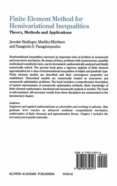 Hemivariational inequalities represent an important class of problems in nonsmooth and nonconvex mechanics. By means of them, problems with nonmonotone, possibly multivalued, constitutive laws can be formulated, mathematically analyzed and finally numerically solved. The present book gives a rigorous analysis of finite element approximation for a class of hemivariational inequalities of elliptic and parabolic type. Finite element models are described and their convergence properties are established. Discretized models are numerically treated as nonconvex and nonsmooth optimization problems. The book includes a comprehensive description of typical representants of nonsmooth optimization methods. Basic knowledge of finite element mathematics, functional and nonsmooth analysis is needed. The book is self-contained, and all necessary results from these disciplines are summarized in the introductory chapter.