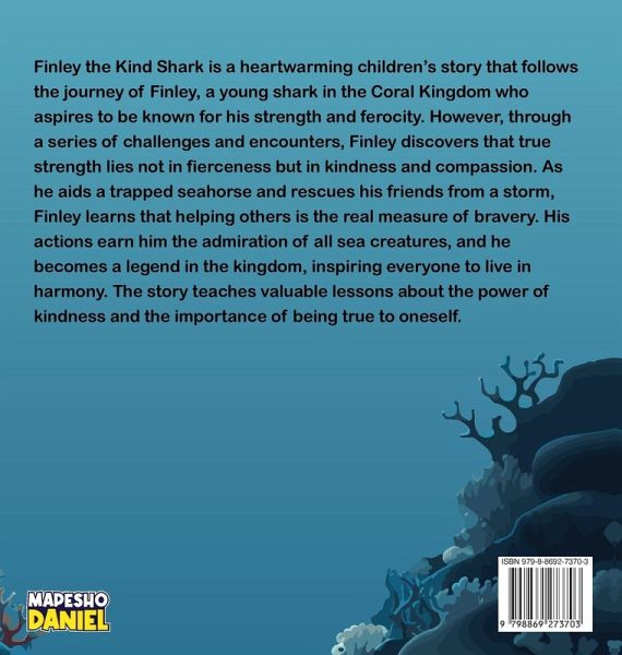 Finley the Kind Shark is a heartwarming children's story that follows the journey of Finley, a young shark in the Coral Kingdom who aspires to be known for his strength and ferocity. However, through a series of challenges and encounters, Finley discovers that true strength lies not in fierceness but in kindness and compassion. As he aids a trapped seahorse and rescues his friends from a storm, Finley learns that helping others is the real measure of bravery. His actions earn him the admiration of all sea creatures, and he becomes a legend in the kingdom, inspiring everyone to live in harmony. The story teaches valuable lessons about the power of kindness and the importance of being true to oneself.