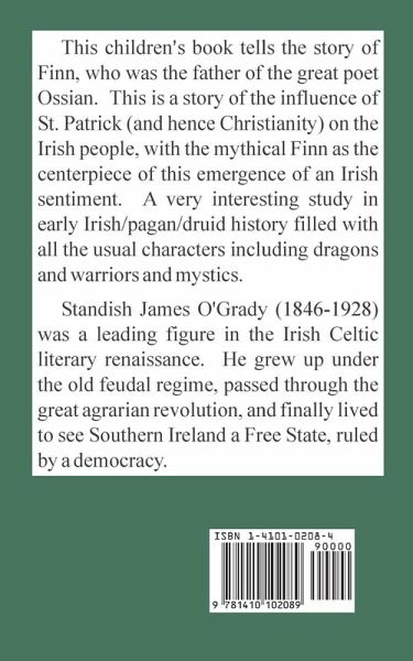 This children's book tells the story of Finn, who was the father of the great poet Ossian. This is a story of the influence of St. Patrick (and hence Christianity) on the Irish people, with the mythical Finn as the centerpiece of this emergence of an Irish sentiment. A very interesting study in early Irish/pagan/druid history filled with all the usual characters including dragons and warriors and mystics. Standish James O'Grady (1846-1928) was a leading figure in the Irish Celtic literary renaissance. He grew up under the old feudal regime, passed through the great agrarian revolution, and finally lived to see Southern Ireland a Free State, ruled by a democracy.