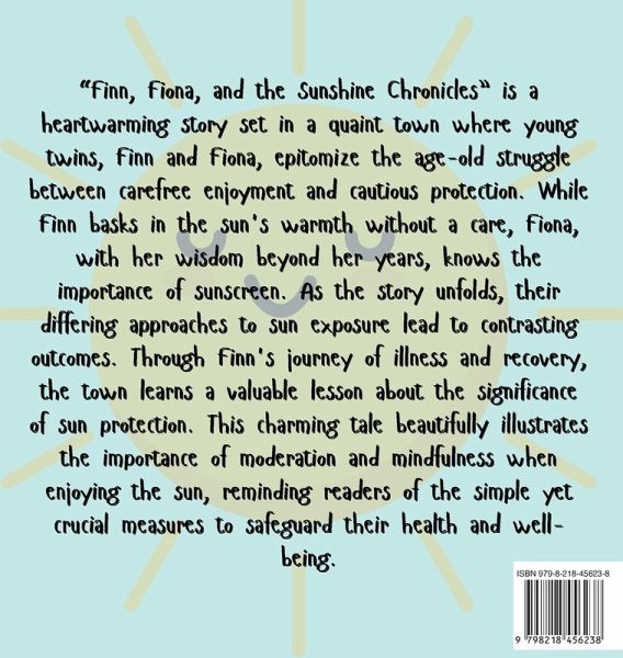 "Finn, Fiona, and the Sunshine Chronicles" is a heartwarming story set in a quaint town where young twins, Finn and Fiona, epitomize the age-old struggle between carefree enjoyment and cautious protection. While Finn basks in the sun's warmth without a care, Fiona, with her wisdom beyond her years, knows the importance of sunscreen. As the story unfolds, their differing approaches to sun exposure lead to contrasting outcomes. Through Finn's journey of illness and recovery, the town learns a valuable lesson about the significance of sun protection. This charming tale beautifully illustrates the importance of moderation and mindfulness when enjoying the sun, reminding readers of the simple yet crucial measures to safeguard their health and well-being.