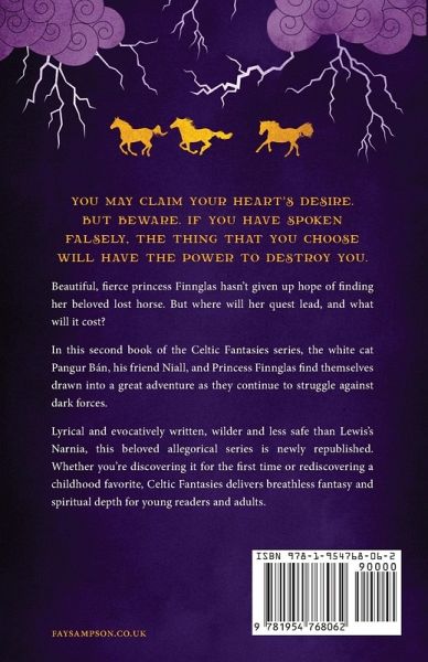 You may claim your heart's desire. But beware. If you have spoken falsely, the thing that you choose will have the power to destroy you. Beautiful, fierce princess Finnglas hasn't given up hope of finding her beloved lost horse. But where will her quest lead, and what will it cost? In this second book of the Celtic Fantasies series, the white cat Pangur Bán, his friend Niall, and Princess Finnglas find themselves drawn into a great adventure as they continue to struggle against dark forces. Lyrical and evocatively written, wilder and less safe than Lewis's Narnia, this beloved allegorical series is newly republished. Whether you're discovering it for the first time or rediscovering a childhood favorite Celtic Fantasies delivers breathless fantasy and spiritual depth for young readers and adults.