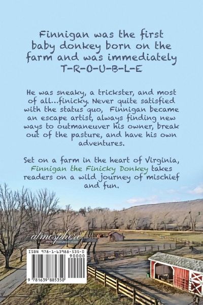 Finnigan was the first baby donkey born on the farm and was immediately T-R-O-U-B-L-E. He was sneaky, a trickster, and most of all...finicky. Never quite satisfied with the status quo, Finnigan became an escape artist, always finding new ways to outmaneuver his owner, break out of the pasture, and have his own adventures. Set on a farm in the heart of Virginia, Finnigan the Finicky Donkey takes readers on a wild journey of mischief and fun.