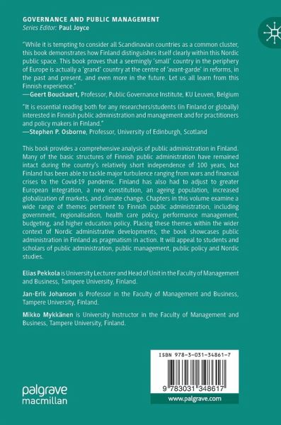 This book provides a comprehensive analysis of public administration in Finland. Many of the basic structures of Finnish public administration have remained intact during the country's relatively short independence of 100 years, but Finland has been able to tackle major turbulence ranging from wars and financial crises to the Covid-19 pandemic. Finland has also had to adjust to greater European integration, a new constitution, an ageing population, increased globalization of markets, and climate change. Chapters in this volume examine a wide range of themes pertinent to Finnish public administration, including government, regionalisation, health care policy, performance management, budgeting, and higher education policy. Placing these themes within the wider context of Nordic administrative developments, the book showcases public administration in Finland as pragmatism in action. It will appeal to students and scholars of public administration, public management, public policyand Nordic studies.