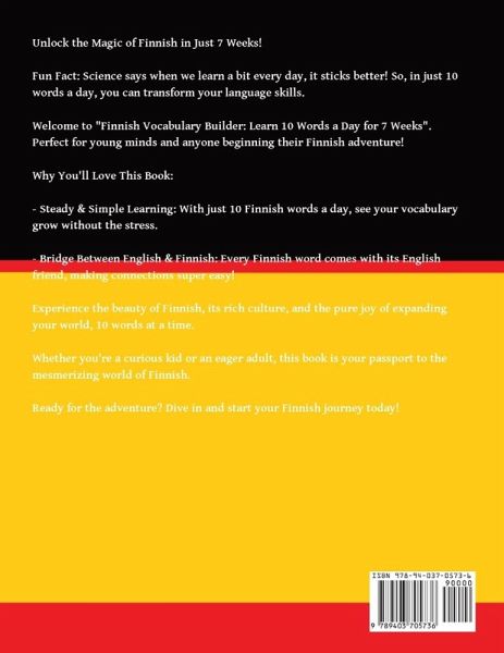 Embark on a seamless journey to master Finnish with 'Finnish Vocabulary Builder: Learn 10 Words a Day for 7 Weeks.' This meticulously crafted guide is designed to introduce young learners and eager beginners to the wonders of the Finnish language.Grounded in the science of daily, bite-sized learning for memory retention, this book presents 10 Finnish words daily, each thoughtfully paired with its English counterpart. The steady, simple approach ensures that your Finnish vocabulary grows progressively without overwhelming you.But it's more than just words; it's an immersion into Finnish culture, heritage, and traditions. With each page, you're not just learning; you're connecting with the heart and soul of Finland. 'Finnish Vocabulary Builder' isn't just a learning tool; it's your passport to a nation and its endearing people.Are you ready to set sail on this Finnish linguistic adventure, 10 words at a time? Dive in, discover, and let the wonders of Finland unfold!