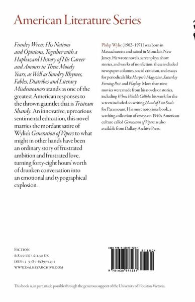 Finnley Wren: His Notions and Opinions, Together with a Haphazard History of His Career and Amours in These Moody Years, as Well as Sundry Rhymes, Fables, Diatribes and Literary Misdemeanors stands as one of the greatest American responses to the thrown gauntlet that is Tristram Shandy. An innovative, uproarious sentimental education, this novel marries the mordant satire of Wylie's Generation of Vipers to what might in other hands have been an ordinary story of frustrated ambition and frustrated love, turning forty-eight hours' worth of drunken conversation into an emotional and typographical explosion.