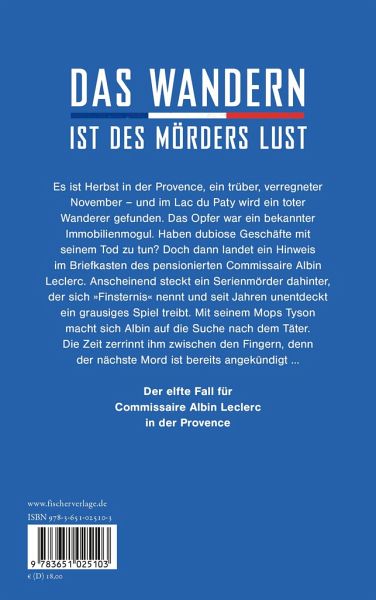 Herbst in der Provence: Ein trüber, verregneter November - und mitten im Lac du Paty wird ein toter Wanderer gefunden. Die Polizei-Capitaines Caterine Castel und Alain Theroux ermitteln. Das Opfer war ein bekannter Immobilienmogul. Haben seine dubiosen Geschäfte mit seinem Tod zu tun? Doch dann landet ein Hinweis im Briefkasten von Ex-Commissaire Albin Leclerc. Anscheinend steckt ein Serientäter dahinter, der sich Finsternis nennt und seit Jahren unentdeckt ein grausiges Spiel treibt. Und dieser Täter fordert Albin heraus, ihn zu fassen. Der Preis: die Familie Leclerc. Es geht um Leben und Tod, und Albin zerrinnt die Zeit zwischen den Fingern ...