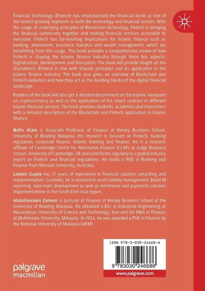 Nafis Alam is Associate Professor of Finance at Henley Business School, University of Reading Malaysia. His research is focused on Fintech, banking regulation, corporate finance, Islamic banking and finance. He is a research affiliate of Cambridge Centre for Alternative Finance (CCAF) at Judge Business School, University of Cambridge, UK and contributes regularly to a global industry report on Fintech and financial regulations. He holds a PhD in Banking and Finance from Monash University, Australia. Lokesh Gupta has more than 18 years of experience in the sector of Financial Technology in Conventional and Islamic Banking Domain as a Techno Functional. He is also the Co-Founder of RM Applications Sdn Bhd. Currently, he is involved in asset liability management, Basel III reporting, data mart development as well as remittance and payments solution implementations in the South East Asia region. He has also co-authored books and publishedarticles in Islamic Banking and Finance. Abdolhossein Zameni is Lecturer of Finance at Henley Business School at the University of Reading Malaysia. He obtained a BSc in Industrial Engineering at Mazandaran University of Science and Technology, Iran and his MBA in Finance at Multimedia University, Malaysia. In 2014, he was awarded a PhD in Finance by the National University of Malaysia (UKM).