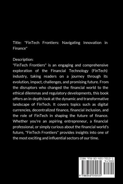Title: "FinTech Frontiers: Navigating Innovation in Finance" Description: "FinTech Frontiers" is an engaging and comprehensive exploration of the Financial Technology (FinTech) industry, taking readers on a journey through its evolution, impact, challenges, and promising future. From the disruptors who changed the financial world to the ethical dilemmas and regulatory developments, this book offers an in-depth look at the dynamic and transformative landscape of FinTech. It covers topics such as digital currencies, decentralized finance, financial inclusion, and the role of FinTech in shaping the future of finance. Whether you're an aspiring entrepreneur, a financial professional, or simply curious about the financial world's future, "FinTech Frontiers" provides insights into one of the most exciting and influential sectors of our time.