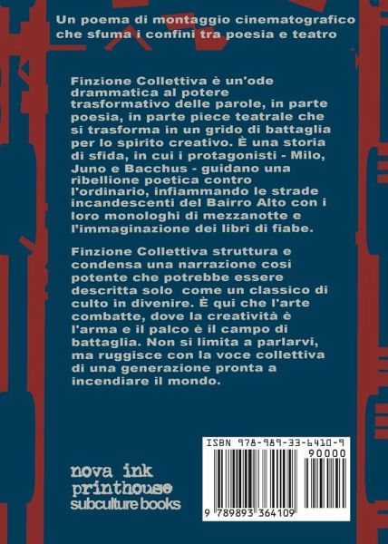"Un poema di montaggio cinematografico che sfuma le linee tra poesia e teatro." Finzione Inc. (Finzione & Co.) è una narrativa colorata e onirica che mescola teatro, mitologia e poesia cinematografica. Al centro della storia c'è Milo, un drammaturgo sotto un incantesimo degli dèi, che si trova intrappolato tra i regni della finzione e della realtà. Insieme a un cast di personaggi eccentrici, Milo e il suo entourage sentono il peso del mondo per adempiere alle loro obbligazioni verso l'Universo e il Teatro Meta. Finzione Inc. è un'ode drammatica al potere trasformativo delle parole, una parte poema, parte opera teatrale che funge da grido di battaglia per lo spirito creativo. È una storia di sfida, in cui i protagonisti-Milo, Juno, Bacchus e Sonny-guidano una ribellione poetica contro l'ordinario, accendendo le incandescenti strade del Bairro Alto con i loro monologhi di mezzanotte e la loro immaginazione da fiaba. Finzione Inc. texture e condensa una narrativa così potente che può essere descritta solo come un cult classico in divenire. Qui l'arte lotta indietro, dove le parole sono l'arma e il palcoscenico è il campo di battaglia. Non parla solo con te; ruggisce con la voce collettiva di una generazione pronta a dare fuoco al mondo. Finzione Inc. esplora temi di creatività, ribellione e potere dell'immaginazione, diventando un manifesto per chiunque osi essere straordinario. È un must per lettori di tutte le generazioni ovunque.