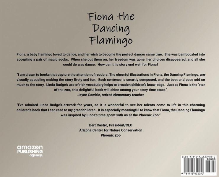 Fiona, a baby flamingo loved to dance, and her wish to become the perfect dancer came true. She was bamboozled into accepting a pair of magic socks. When she put them on, her freedom was gone, her choices disappeared, and all she could do was dance. How can this story end well for Fiona? Thru Lindaa's imaginative illustrations, she has created a fascinating tale. One that teaches children "all is not as it seems." Linda is an award winning animal artist. Her images have been on magazine covers, greeting cards, limited edition prints, calendars, and collector plates. Her paintings have been accepted into national and international shows. For more details about Linda's life see Lindabudge.com "I've admired Linda Budge's artwork for years, so it is wonderful to see her talents come to life in this charming children's book that I can read to my grandchildren. It's especially meaningful to know that Fiona, the Dancing Flamingo was inspired by Linda's time spent with us at the Phoenix Zoo." Bert Castro, President/CEO Arizona Center for Nature Conservation, Phoenix Zoo"