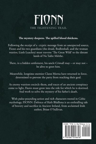 The mystery deepens. The spilled blood thickens. Following the receipt of a cryptic message from an unexpected source, Fionn and his two guardians (the druid, Bodhmhall and the woman warrior, Liath Luachra) must traverse 'The Great Wild' to the distant lands of Na Tailte Méithe. There, in a hidden settlement, his uncle Crimall may - or may not - be alive to greet him. Meanwhile, longtime enemies Clann Morna have returned in force, determined to prevent the party from reaching their goal. As enemy warriors encircle them and traces of an ancient conspiracy come to light, Fionn must grow into the role for which he is destined. And work to solve the mystery of his father's death. With pulse-pounding action and rich characters rooted in Celtic mythology, FIONN: The Tightening Trail is an enthralling tale of bravery and resilience in ancient Ireland from acclaimed Irish author, Brian O'Sullivan.
