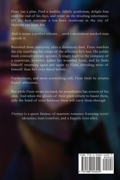 Fiore has a plan. Find a wealthy elderly gentleman, delight him until the end of his days, and retire on the resulting inheritance. It's the best outcome a low-born courtesan in the city of Halcyon can hope for. And it seems a perfect scheme... until a mysterious masked man upends it. Banished from university after a disastrous duel, Enzo wanders the city searching for scraps of the affection he's lost. His public mask conceals private agonies. A single night in the company of a courtesan, however, balms his wounded heart, and he finds himself returning again and again to Fiore, revealing more of himself than he's ever dared before. Furthermore, and more astonishing still, Fiore finds he returns Enzo's affections. But while Fiore wears no mask, he nonetheless has secrets of his own. And when the ghosts of their pasts return to haunt them, only the bond of trust between them will carry them through. ~ Fiorenzo is a queer fantasy-of-manners romance featuring secret identities, hurt/comfort, and a happily-ever-after.