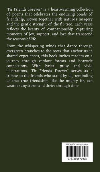"Fir Friends Forever" is a heartwarming collection of poems that celebrates the enduring bonds of friendship, woven together with nature's imagery and the gentle strength of the fir tree. Each verse reflects the beauty of companionship, capturing moments of joy, support, and love that transcend the seasons of life. From the whispering winds that dance through evergreen branches to the roots that anchor us in shared experiences, this book invites readers on a journey through verdant forests and heartfelt connections. With lyrical prose and vivid illustrations, "Fir Friends Forever" serves as a tribute to the friends who stand by us, reminding us that true friendship, like the mighty fir, can weather any storm and thrive through time.
