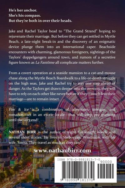 He's her anchor. She's his compass. But they're both in over their heads. Jake and Rachel Taylor head to "The Grand Strand" hoping to rejuvenate their marriage. But before they can get settled in Myrtle Beach, a late-night break-in and the discovery of an enigmatic device plunge them into an international caper. Beachside encounters with charming, glamorous foreigners, sightings of the Taylors' doppelgangers around town, and rumors of a secretive figure known as La Fantôme all complicate matters further. From a covert operation at a seaside mansion to a cat-and-mouse chase along the Myrtle Beach Boardwalk to a life-or-death struggle on the high seas, Jake and Rachel try to stay one step ahead of danger. As the Taylors get drawn deeper into the mystery, they will have to rely on each other like never before if they-much less their marriage-are to remain intact. Fire & Ice is a combination of adventure, intrigue, and romance-set in an exotic locale-that will keep you guessing until the very end!