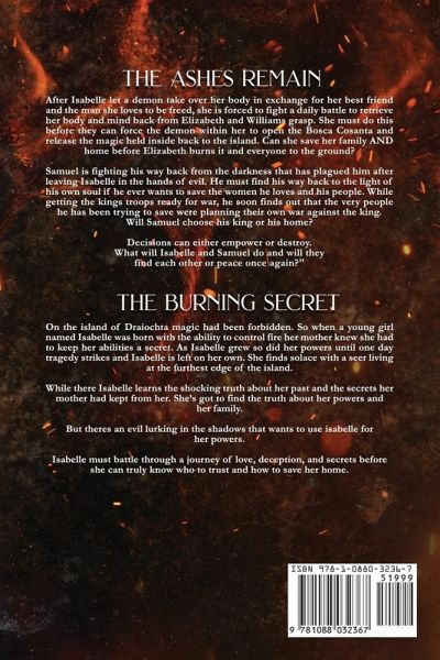 Part 1 The Burning Secret On the island of Draiochta magic had been forbidden. So when a young girl named Isabelle was born with the ability to control fire her mother knew she had to keep her abilities a secret. As Isabelle grew so did her powers until one day tragedy strikes and Isabelle is left on her own. She finds solace with a seer living at the furthest edge of the island. While there Isabelle learns the shocking truth about her past and the secrets her mother had kept from her. She's got to find the truth about her powers and her family. But theres an evil lurking in the shadows that wants to use isabelle for her powers. Isabelle must battle through a journey of love, deception, and secrets before she can truly know who to trust and how to save her home. Part 2 The Ashes Remain After Isabelle let a demon take over her body in exchange for her best friend and the man she loves to be freed, she is forced to fight a daily battle to retrieve her body and mind back from Elizabeth and Williams grasp. She must do this before they can force the demon within her to open the Bosca Cosanta and release the magic held inside back to the island. Can she save her family AND home before Elizabeth burns it and everyone to the ground? Samuel is fighting his way back from the darkness that has plagued him after leaving Isabelle in the hands of evil. He must find his way back to the light of his own soul if he ever wants to save the women he loves and his people. While getting the kings troops ready for war, he soon finds out that the very people he has been trying to save were planning their own war against the king. Will Samuel choose his king or his home? Decisions can either empower or destroy. What will Isabelle and Samuel do and will they find each other or peace once again?"