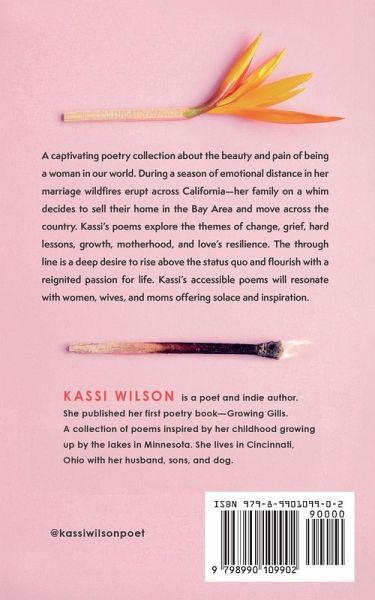 A captivating poetry collection about the beauty and pain of being a woman in our world. During a season of emotional distance in her marriage wildfires erupt across California-her family on a whim decides to sell their home in the Bay Area and move across the country. Kassi's poems explore the themes of change, grief, hard lessons, growth, motherhood, and love's resilience. The through line is a deep desire to rise above the status quo and flourish with a reignited passion for life. Kassi's accessible poems will resonate with women, wives, and moms offering solace and inspiration. Kassi Wilson's full-length poetry book of free-verse and prose explores the nature of being a woman-our ability to heal and flourish through adversity in spite of culture's proneness to despair. Women will see themselves in a new light one that uplifts them to dream and still hope in the beauty of our world. Inspirational poems Motivational book for women Postpartum inspiration Emotional healing Overcoming Fear Love's resilience Inspiration to dream again Flourishing through adversity Having hope in hard seasons New Beginnings Perfect gift forMother's Day Baby Showers Valentine's Day Anniversary Gift Birthday Gift Get-Well Gift Spring Celebrations Earth Day