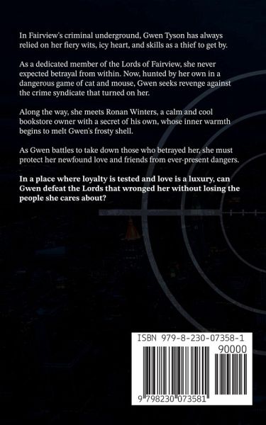 In Fairview's criminal underground, Gwen Tyson has always relied on her fiery wits, icy heart, and skills as a thief to get by. As a dedicated member of the Lords of Fairview, she never expected betrayal from within. Now, hunted by her own in a dangerous game of cat and mouse, Gwen seeks revenge against the crime syndicate that turned on her. Along the way, she meets Ronan Winters, a calm and cool bookstore owner with a secret of his own, whose inner warmth begins to melt Gwen's frosty shell. As Gwen battles to take down those who betrayed her, she must protect her newfound love and friends from ever-present dangers. In a place where loyalty is tested and love is a luxury, can Gwen defeat the Lords that wronged her without losing the people she cares about?