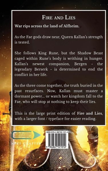 War rips across the land of Alfheim. As the Fae gods draw near, Queen Kallan's strength is tested. She follows King Rune, but the Shadow Beast caged within Rune's body is writhing in hunger. Kallan's newest companion, Bergen - the legendary Berserk - is determined to end the conflict in her life. As the three come together, the truth buried in the past resurfaces. Now, Kallan must master a dormant power... or watch her kingdom fall to the Fae, who will stop at nothing to keep their lies. This is the large print edition of Fire and Lies, with a larger font / typeface for easier reading.