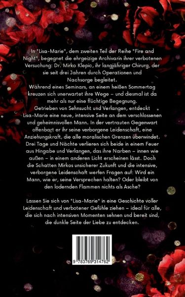 In Lisa-Marie, dem zweiten Teil der Reihe Fire and Night, begegnet die ehrgeizige Archivarin ihrer verbotenen Versuchung: Dr. Mirko Klepic, ihr langjähriger Chirurg, der sie seit drei Jahren durch Operationen und Nachsorge begleitet. Während eines Seminars, an einem heißen Sommertag kreuzen sich unerwartet ihre Wege - und diesmal ist da mehr als nur eine flüchtige Begegnung. Getrieben von Sehnsucht und Verlangen, entdeckt Lisa-Marie eine neue, intensive Seite an dem verschlossenen und geheimnisvollen Mann. In der vertrauten Gegenwart offenbart er ihr seine verborgene Leidenschaft, eine Anziehungskraft, die alle moralischen Grenzen überwindet. Drei Tage und Nächte verlieren sich beide in einem Feuer aus Hingabe und Verlangen, das ihre Narben Innen wie außen, in einem anderen Licht erscheinen lässt. Doch die Schatten Mirkos unsicherer Zukunft und die intensive, verborgene Leidenschaft werfen Fragen auf: Wird ein Mann, wie er, seine Versprechen halten? Oder bleibt von den lodernden Flammen nichts als Asche? Lassen Sie sich von Lisa-Marie in eine Geschichte voller Leidenschaft und verbotener Gefühle ziehen - ideal für alle, die sich nach intensiven Momenten sehnen und bereit sind, die dunkle Seite der Liebe zu entdecken.