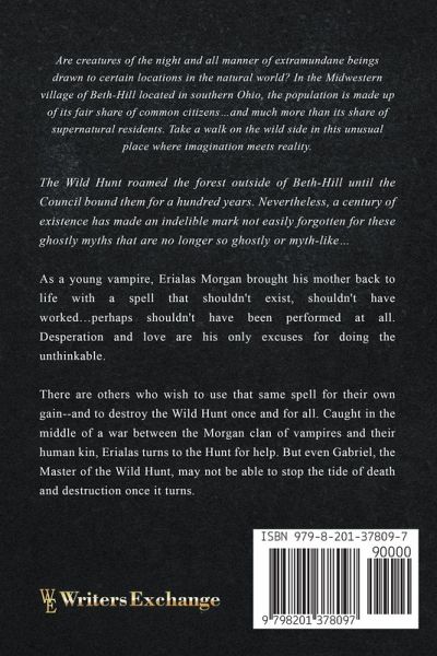 The Wild Hunt roamed the forest outside of Beth-Hill until the Council bound them for a hundred years. Nevertheless, a century of existence has made an indelible mark not easily forgotten for these ghostly myths that are no longer so ghostly or myth-like... As a young vampire, Erialas Morgan brought his mother back to life with a spell that shouldn't exist, shouldn't have worked...perhaps shouldn't have been performed at all. Desperation and love are his only excuses for doing the unthinkable. There are others who wish to use that same spell for their own gain--and to destroy the Wild Hunt once and for all. Caught in the middle of a war between the Morgan clan of vampires and their human kin, Erialas turns to the Hunt for help. But even Gabriel, the Master of the Wild Hunt, may not be able to stop the tide of death and destruction once it turns.