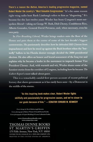 There's a reason The Nation, America's leading progressive magazine, named Robert Wexler the country's "Most Valuable Congressman." It's the same reason right-wing radio host Rush Limbaugh refers to him as "disgusting." It's because for the last twelve years Wexler has been Congress's most outspoken liberal -- taking on George W. Bush, Dick Cheney, Condoleezza Rice, Alberto Gonzales, General David Petraeus, and, when necessary, even his own party. In Fire-Breathing Liberal, Wexler brings readers onto the floor of the House and puts them at the center of some of the last decade's biggest controversies. He passionately describes how he defended Bill Clinton from impeachment and how he stood up against the Bush brothers when the "butterfly" ballots in his Florida district wrongly decided the 2000 presidential election. He also offers an honest and brutal assessment of the Iraq war and explains why he has become a leader in the movement to impeach Vice President Cheney. And, with warmth and wit, Wexler shares some of the funniest stories from the corridors of Congress, including how he became The Colbert Report's most talked-about guest. This is a remarkably candid first-person account of recent political history that shows government as it has rarely been seen -- by a Democrat in the middle of the storms.
