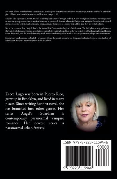 For lovers of true romance comes an intense and thrilling love story that will steal your breath away! Immerse yourself in a time and place of fierce warriors, daring women, and love that conquers all. Decades after a pandemic, North America is ruled by lords, men of strength and will. Victor Strongheart, lord and warrior, journeys to meet the young woman that as required by treaty, he must wed. Annasai is beautiful, bright, and seductive. Strongheart is pleased. Annasai's cousin, Setiyah, is all nettles and stings, dark and dangerous as a stormy night. He is glad she's not to be his bride. But at the betrothal feast, Setiyah dances the sensual Fire Dance under the glow of a full moon. The darkly bewitching girl moves to the beat of tribal drums. Firelight lays shadows on the hollow at the base of her neck. The soft slope of her breasts glows golden and warm. She whirls, and the sound of the tiny beads woven into her myriad of braids is like the patter of raindrops on a summer's eve. Strongheart watches as one enthralled. He knows well that the heart is a treacherous thing, and his has just betrayed him. But Setiyah is forbidden fruit; one he can only taste at the risk of war.