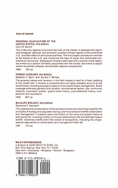 Regional Silviculture of the United States, 2nd Edition John W. Barrett This is the only regional silviculture text now on the market. It assesses the significant biological, physical, and economic qualities of forest regions in the continental U.S., and their effect on silviculture practices. The first chapter provides an overview of the forests of the U.S. and introduces the topic of social and institutional constraints on silviculture. Subsequent chapters each deal with a specific forest region, are written by a person intimately acquainted with the locality, and follow a regular outline to provide cohesion and facilitate regional comparisons. 1980 551 pp. Forest Ecology, 3rd Edition Stephen H. Spurr and Burton V. Barnes The growing interest and literature in this field created a need for a fresh updating of this classic text. It remains a comprehensive yet highly readable account of real world forests, including ecological aspects of successful forest management. Broad coverage embraces genetics and variation, environmental factors, site, community relations, ecosystem studies, glacial forest history, post-settlement history, compostition and succession. 1980 687 pp. Wildlife Biology, 2nd Edition Raymond F. Dasmann This updated and revised edition of the standard introductory text brings together the principles of ecology and population biology and the practice of wildlife conservation and management. It presents basic information on the value and present status of wild animal life, including a history of human relationships with and attitudes toward wildlife. Examines wildlife within the context of ecosystems, indicating why single-species approaches to conservation and management often fail. 1981 212 pp.