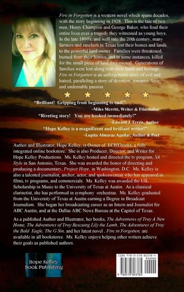 5 STARS! "Brilliant novel! Gripping from beginning to end!" Miles Merritt, Writer and Filmmaker "Riveting story! You are hooked immediately!" ~Edward J. Ferris, Author "Hope Kelley is a magnificent and brilliant writer!" ~Lupita Almaraz Aguilar, Author and Poet Fire in Forgotten is a western novel spanning decades, with the story beginning in 1928. This is the tale of two men, Henry Champion and George Baker, who feud their entire lives over a tragic incident they witnessed as young boys. In the late 1800's, and well into the 20th century, many farmers and ranchers in Texas lost their homes and land to the powerful land owner. Families were threatened, burned from their homes, and in some instances, killed for the small piece of land they owned. Generations of families were lost along with their lands and heritage. Fire in Forgotten is an unforgettable story of evil and hatred, paralleling a story of devotion, love, and undeniable passion. Author and Illustrator, Hope Kelley, is Owner of ECBYbooks, a fully integrated online bookstore. She is also Producer, Director, and Writer for Hope Kelley Productions. Ms. Kelley hosted and directed the tv program, SA Style in San Antonio, Texas. She was awarded the honor of directing and producing a documentary, Project Hope, in Washington, D.C. Ms. Kelley is also a talented journalist, anchor, actor, and spokeswoman who has appeared in films, tv programs, and commercials. Ms. Kelley was awarded the UIL Scholarship in Music to the University of Texas at Austin. As a classical clarinetist, she has performed in symphony orchestras. Ms. Kelley graduated from the University of Texas at Austin earning a Degree in Broadcast Journalism. She began her broadcasting career as an Intern and Journalist for ABC Austin, and at the Dallas ABC News Bureau at the Capitol of Texas. As a published Author and Illustrator, her books, The Adventures of Troy A New Home, The Adventures of Troy Rescuing Lily the Lamb, The Adventures of Troy the Bald Eagle, The G Sin, and her latest novel , Fire in Forgotten, are available in all bookstores. Ms. Kelley enjoys helping other writers achieve their goals as published authors.