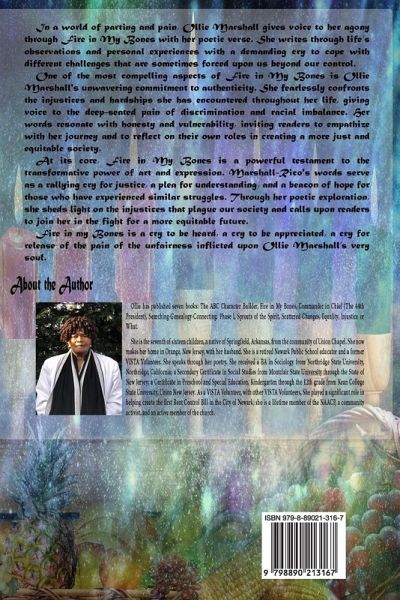 In a world of parting and pain, Ollie Marshall gives voice to her agony through Fire in My Bones with her poetic verse. She writes through life's observations and personal experiences with a demanding cry to cope with different challenges that are sometimes forced upon us beyond our control. One of the most compelling aspects of Fire in My Bones is Ollie Marshall's unwavering commitment to authenticity. She fearlessly confronts the injustices and hardships she has encountered throughout her life, giving voice to the deep-seated pain of discrimination and racial imbalance. Her words resonate with honesty and vulnerability, inviting readers to empathize with her journey and to reflect on their own roles in creating a more just and equitable society. At its core, Fire in My Bones is a powerful testament to the transformative power of art and expression. Marshall-Rico's words serve as a rallying cry for justice, a plea for understanding, and a beacon of hope for those who have experienced similar struggles. Through her poetic exploration, she sheds light on the injustices that plague our society and calls upon readers to join her in the fight for a more equitable future. Fire in my Bones is a cry to be heard, a cry to be appreciated, a cry for release of the pain of the unfairness inflicted upon Ollie Marshall's very soul.
