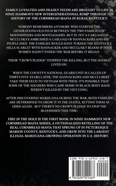 Family loyalties and deadly feuds are brought to life in Ninie Hammon's new intergenerational romp through the history of The Cornbread Mafia in rural Kentucky. Nobody remembers anymore who started the generations-old feud between the two families of moonshiners and bootleggers. But in 1933 a carload of McCluskys ambushed a carload of Hannackers and six people died. The families would have turned the Kentucky hills scarlet with Hannacker and McClusky blood if four women hadn't ended the war before it began. Their "Crow's Pledge" stopped the killing, but the hatred lived on. When the county's National Guard unit is called up thirty-five years later, the Hannackers and McCluskys take their feud to Vietnam with them. It's possible that some of the soldiers who came home in black body bags weren't killed by the Viet Cong. After discovering marijuana during the war, both families are determined to grow it in the States, setting them at odds again. But there's no Crow's Pledge to stop the bloodshed this time. Fire In The Hole is the first book in Ninie Hammon's new Cornbread Mafia series, a fictionalized retelling of the real Cornbread Mafia that sprung up in picturesque Marion County, Kentucky, and grew into the largest illegal marijuana-growing operation in U.S. history.