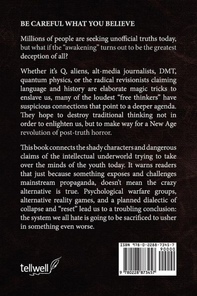 BE CAREFUL WHAT YOU BELIEVE Millions of people are seeking unofficial truths today, but what if the "awakening" turns out to be the greatest deception of all? Whether it's Q, aliens, alt-media journalists, DMT, quantum physics, or the radical revisionists claiming language and history are elaborate magic tricks to enslave us, many of the loudest "free thinkers" have suspicious connections that point to a deeper agenda. They hope to destroy traditional thinking not in order to enlighten us, but to make way for a New Age revolution of post-truth horror. This book connects the shady characters and dangerous claims of the intellectual underworld trying to take over the minds of the youth today. It warns readers that just because something exposes and challenges mainstream propaganda, doesn't mean the crazy alternative is true. Psychological warfare groups, alternative reality games, and a planned dialectic of collapse and "reset" lead us to a troubling conclusion: the system we all hate is going to be sacrificed to usher in something even worse.