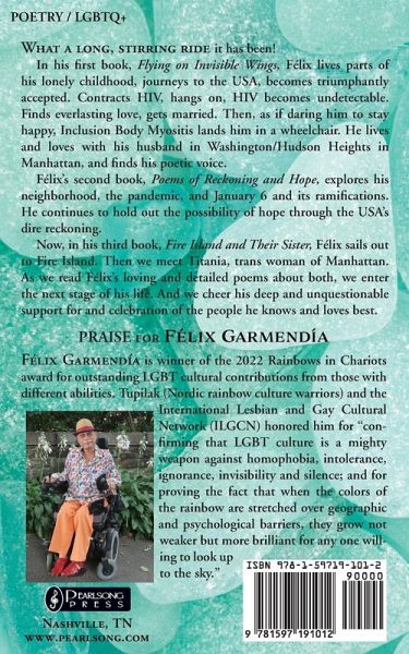 In his third book of poetry, Fe¿lix Garmendi¿a celebrates the popular LGBTQ+ vacation destinations of Fire Island and commemorates Titania, a trans woman of Manhattan. In his first book, Flying On Invisible Wings, Fe¿lix lives parts of his lonely childhood, journeys to the USA, becomes triumphantly accepted. Contracts HIV, hangs on, HIV becomes undetectable. Finds everlasting love, gets married. Then, as if daring him to stay happy, Inclusion Body Myositis lands him in a wheelchair. He continues to live and love with his husband in Washington/Hudson Heights in Manhattan, and finds his poetic voice. Fe¿lix's second book, Poems of Reckoning and Hope, explores his neighborhood, the pandemic, and January 6 and its ramifications. He continues to hold out the possibility of hope through the USA's dire recokoning. Now, in his third book, Félix sails to Fire Island. Then we meet Titania, trans woman of Manhattan. As we read Fe¿lix's detailed poems about both, we enter the next stage of his life. And we cheer his deep and unquestionable support for and celebration of the people he knows and loves best.