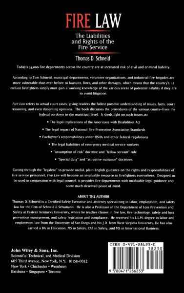 Fire Law The Liabilities and Rights of the Fire Service Thomas D. Schneid Today's 34,000 fire departments across the country are at increased risk of civil and criminal liability. According to Tom Schneid, municipal departments, volunteer organizations, and industrial fire brigades are more vulnerable than ever before to lawsuits, fines, and other damages, which means that the country's 1.2 million firefighters simply must gain a working knowledge of the various areas of potential liability if they are to avoid litigation. Fire Law refers to actual court cases, giving readers the fullest possible understanding of issues, facts, court reasoning, and even dissenting opinions. The book discusses the procedures of the various courts--from the federal on down to the municipal level. It sheds light on such issues as: * The legal implications of the Americans with Disabilities Act * The legal impact of National Fire Protection Association Standards * Firefighter's responsibilities under OSHA and other federal regulations * The legal liabilities of emergency medical service workers * "Assumption of risk" doctrine and "fellow servant" rule * "Special duty" and "attractive nuisance" doctrines Cutting through the "legalese" to provide useful, plain-English guidance on the rights and responsibilities of fire service personnel, Fire Law will become an invaluable resource to firefighters everywhere. Designed to be used in conjunction with legal counsel, it provides fire departments with invaluable legal guidance and some much-deserved peace of mind.