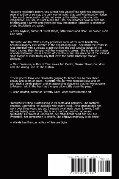 In this passionate collection of poetry Nicolette van der Walt shares with her readers the intimacy of her very marrow. It more than a poet who shares their heart and soul through the beauty of flowers or the tragedy of their short lives, with Nicolette it is depth of love as it smolders within long after the fire has grown cool; her poetry is a window into longing that is more intense than mere desire. Then by turns of sunlight and flowers, she is every season of the earth as she guides her readers into unblinking truths that are as luminous in the dance of sublime understanding of love and loss, as they are of intimacy, lust, parenting, nature, society and celebrations. You will want this book on your nightstand for bedtime reading and dreaming.