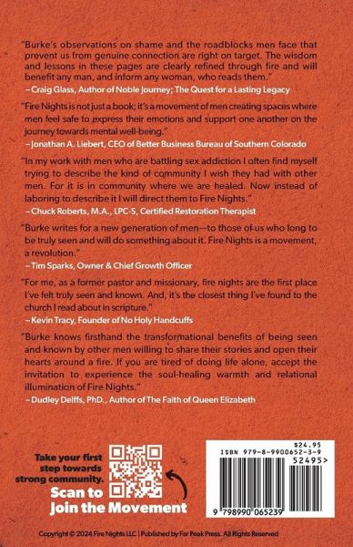 Transform loneliness into brotherhood. When loneliness is an epidemic and addiction and suicide rates among men are alarmingly high, Fire Nights offers a refreshing solution. Burke Atkerson invites you into a transformative experience that challenges the status quo of masculinity, offering a bold, raw, and deeply inspiring response to the crisis of male isolation. Fire Nights is not merely a book; it's a movement-a clear guide to forging deep, meaningful connections. Atkerson, with heart-wrenching honesty, shares his healing journey and the stories of men who have found strength, healing, and camaraderie around the flickering flames of a fire. This book is a testament to the power of vulnerability, brotherhood, and the pursuit of authentic community. Praised by therapists, pastors, and leaders from all walks of life, Fire Nights has been heralded as:"Burke's observations on shame and the roadblocks men face that prevent us from genuine connection are right on target." -Craig Glass, Author "If you are tired of doing life alone, accept the invitation to experience the soul-healing warmth and relational illumination of Fire Nights. -Dudley Delffs, PhD "For me, as a former pastor and missionary, fire nights are the first place I've felt truly seen and known." -Kevin Tracy, Founder "Burke has the scars to speak." -Kris Watson, CEO "Burke bridges the gap of complex theories and practical application of understanding our souls desires." -Tom Schlosser, LPC. "Fire Nights is a movement, a revolution." -Tim Sparks, CGO "Fire Nights encapsulates the essence of men's mental health with raw authenticity and profound insight." -Jonathan A. Liebert, CEO "With so much in jeopardy and grasping for the survival of the male identity, ego, and psyche, Burke gets to the heart of one of our deepest, masculine problems: vulnerability." -Aaron Brown, PhD "A brave book of honest truth for all men to hear." -Jonathan Jordan, Author "Fire Nights provides a framework to share deep laughs, cigars if you please, and the safe revelation of all that rattles in our souls." -Ben Wilson, LPC Through personal anecdotes, engaging storytelling, and actionable advice, Atkerson equips you with the tools to break free from the shackles of solitude. Discover how to cultivate the deep, transformational relationships that every man craves and deserves. Learn to navigate the obstacles of shame and vulnerability with courage and grace, embarking on a journey toward mental health and emotional maturity. Are you ready to embrace the warmth and clarity that comes from genuine connection and shared struggles? Are you prepared to be part of a movement that redefines masculinity and reclaims brotherhood? Fire Nights is more than just a book-it's your invitation to join thousands of men across the country who are already experiencing the life-changing magic of Fire Nights in their own backyards. This is your moment to step out of the shadows and into the light, to find solace in the stories of others, and to ignite the flames of friendship and understanding. Take the first step towards a life marked by deep laughter, real conversations, and the unbreakable bonds of brotherhood. Light your fire with Fire Nights.