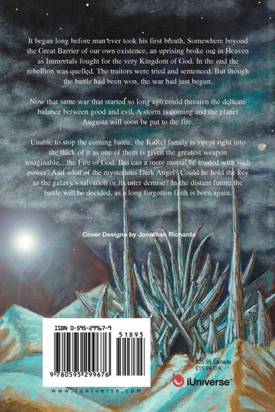 It began long before man ever took his first breath. Somewhere beyond the Great Barrier of our own existence, an uprising broke out in Heaven as Immortals fought for the very Kingdom of God. In the end the rebellion was quelled. The traitors were tried and sentenced. But though the battle had been won, the war had just begun. Now that same war that started so long ago could threaten the delicate balance between good and evil. A storm is coming and the planet Augusta will soon be put to the fire. Unable to stop the coming battle, the KaRel family is swept right into the thick of it as one of them is given the greatest weapon imaginable...the Fire of God. But can a mere mortal be trusted with such power? And what of the mysterious Dark Angel? Could he hold the key to the galaxy's salvation or its utter demise? In the distant future the battle will be decided, as a long forgotten faith is born again.