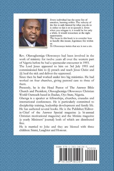 Every individual has the same fire of emotion, burning within. The velocity of the fire is only limited by what you do to it: either to fan it or to quench it. Even when you relegate it, it would be for only a while. It would resuscitate at the right opportunity. The focus in this book is to consider how to handle this innate, legitimate fire within us. Dr Olowosoyo insists that sex is not a sin in itself. As a matter of fact, it is created by God and honored by God for the benefit of our marital relationships.