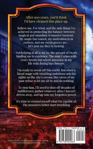 After 900 years, you'd think I'd have cleaned this place up. Believe me, I've tried, and the only thing I've achieved in protecting the balance between magical and mundane is massive burnout. My magic has waned, my motivation is in embers, and my social graces are... let's just say they're lacking. Not helping at all is my ex, the servant of Death binding me to existence. The man I crave with every breath but whose presence in my life risks losing him forever. I'm ready to swear off this world. But when a blood mage with troubling ambitions sets his sights on the city's covens, the voices of my past refuse to let me sit by and do nothing. To stop him, I'll need to dust off decades of indifference, gather whatever allies I haven't driven away, and tap into my forgotten power. It's time to remind myself what I'm capable of. The monsters better start trembling.