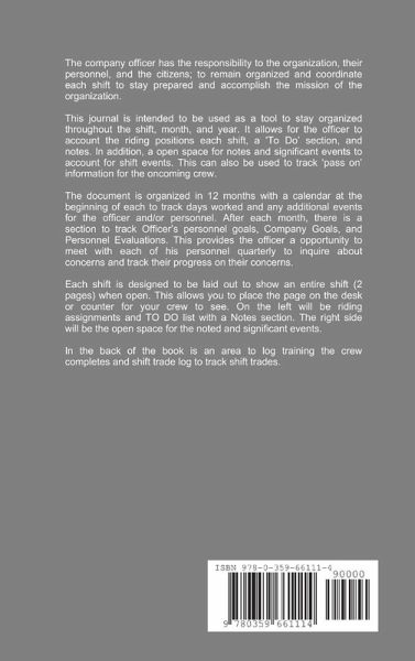 This journal is intended to be used as a tool to stay organized throughout the shift, month, and year. It allows for the officer to account the riding positions each shift, a 'To Do' section, and notes. In addition, a open space for notes and significant events to account for shift events. The document is organized in 12 months with a calendar at the beginning of each to track days worked and any additional events for the officer and/or personnel. After each month, there is a section to track Officer's personnel goals, Company Goals, and Personnel Evaluations. Each shift is designed to be laid out to show an entire shift (2 pages) when open. This allows you to place the page on the desk or counter for your crew to see. On the left will be riding assignments and TO DO list with a Notes section. The right side will be the open space for the noted and significant events. In the back of the book is an area to log training the crew completes and shift trade log to track shift trades.