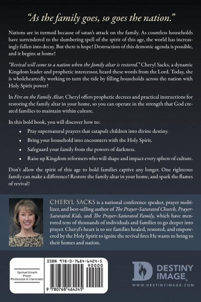 "As the family goes, so goes the nation." Nations are in turmoil because of satan's attack on the family. As countless households have surrendered to the slumbering spell of the spirit of this age, the world has increasingly fallen into decay. But there is hope! Destruction of this demonic agenda is possible, and it begins at home! "Revival will come to a nation when the family altar is restored." Cheryl Sacks, a dynamic Kingdom leader and prophetic intercessor, heard these words from the Lord. Today, she is wholeheartedly working to turn the tide by filling households across the nation with Holy Spirit power! In Fire on the Family Altar, Cheryl offers prophetic decrees and practical instructions for restoring the family altar in your home, so you can operate in the strength that God created families to maintain within culture. In this bold book, you will discover how to: Pray supernatural prayers that catapult children into divine destiny. Bring your household into encounters with the Holy Spirit. Safeguard your family from the powers of darkness. Raise up Kingdom reformers who will shape and impact every sphere of culture. Don't allow the spirit of this age to hold families captive any longer. One righteous family can make a difference! Restore the family altar in your home, and spark the flames of revival!