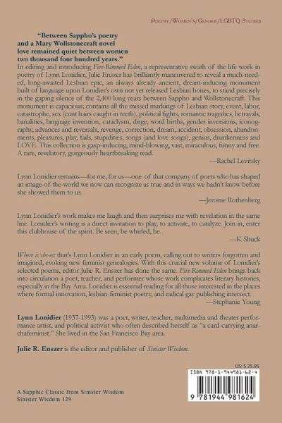 Fire-Rimmed Eden: Selected Poems gathers poems from Lynn Lonidier's rich and varied collections. Lonidier published five poetry collections Po Tree (1967), The Female Freeway (1970), A Lesbian Estate (1977), Woman Explorer (1979), Clitoris Lost: A Woman's Version of the Creation Myth (1989), and a posthumous book, The Rhyme of the Ag-ed Mariness (2001). Her poetry links multiple poetic constellations of the 1970s and 1980s demonstrating linguistic innovations and radical reconfigurations sexuality and gender. The poems of Fire-Rimmed Eden are in conversation with narrative impulses from the feminist and lesbian poetry movements of the 1970s and 1980s, including work by Judy Grahn, Audre Lorde, Adrienne Rich, and others, as well as experimental poetic impulses from the same period found in work by Robert Duncan (Duncan's partner Jess gave the cover art for A Lesbian Estate), Lyn Hejinian, Carla Harryman, and Etel Adnan. Some of Lonidier's work is concrete in the spirit of May Swenson's Iconographs while other poems are performative like Bay area poets Pat Parker and Jerome Rothenberg. Previously completely out of print, Lonidier's poetry is ripe for a new generation of readers. Fire-Rimmed Eden assembles a robust selection of Lonidier's work introduced by Sinister Wisdom editor and publisher Julie R. Enszer. Rich and diverse, visually and aurally exciting, boldly experimental and intellectually provocative, Lonidier's poetry is imbued with wit, humor, originality, and play.