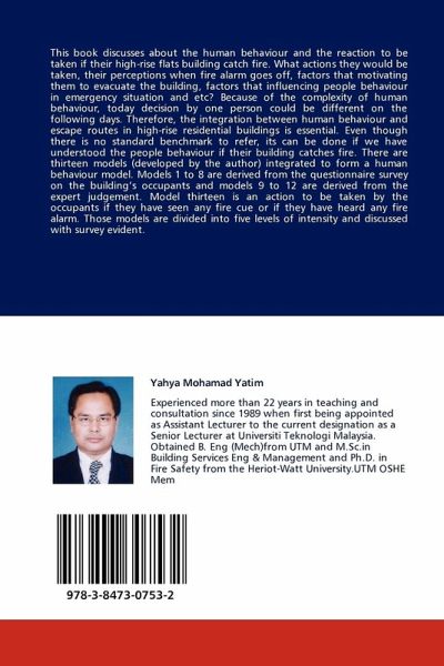 This book discusses about the human behaviour and the reaction to be taken if their high-rise flats building catch fire. What actions they would be taken, their perceptions when fire alarm goes off, factors that motivating them to evacuate the building, factors that influencing people behaviour in emergency situation and etc? Because of the complexity of human behaviour, today decision by one person could be different on the following days. Therefore, the integration between human behaviour and escape routes in high-rise residential buildings is essential. Even though there is no standard benchmark to refer, its can be done if we have understood the people behaviour if their building catches fire. There are thirteen models (developed by the author) integrated to form a human behaviour model. Models 1 to 8 are derived from the questionnaire survey on the building s occupants and models 9 to 12 are derived from the expert judgement. Model thirteen is an action to be taken by the occupants if they have seen any fire cue or if they have heard any fire alarm. Those models are divided into five levels of intensity and discussed with survey evident.