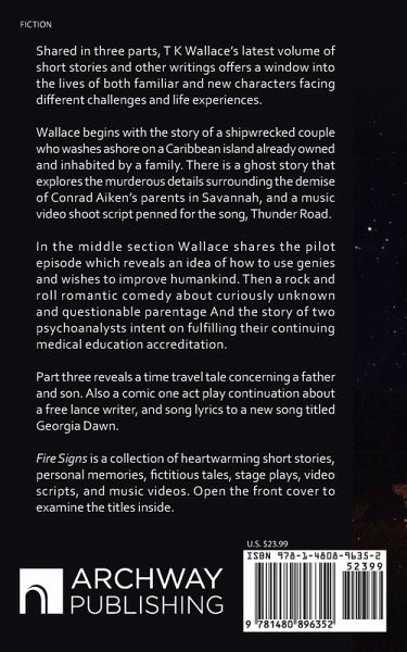 Shared in three parts, T K Wallace's latest volume of short stories and other writings offers a window into the lives of both familiar and new characters facing different challenges and life experiences. Wallace begins with the story of a shipwrecked couple who washes ashore on a Caribbean island already owned and inhabited by a family. There is a ghost story that explores the murderous details surrounding the demise of Conrad Aiken's parents in Savannah, and a music video shoot script penned for the song, Thunder Road. In the middle section Wallace shares the pilot episode which reveals an idea of how to use genies and wishes to improve humankind. Then a rock and roll romantic comedy about curiously unknown and questionable parentage And the story of two psychoanalysts intent on fulfilling their continuing medical education accreditation. Part three reveals a time travel tale concerning a father and son. Also a comic one act play continuation about a free lance writer, and song lyrics to a new song titled Georgia Dawn. Fire Signs is a collection of heartwarming short stories, personal memories, fictitious tales, stage plays, video scripts, and music videos. Open the front cover to examine the titles inside.