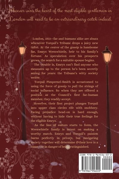 Whoever wins the heart of the most eligible gentleman in London will need to be an extraordinary catch indeed. London, 1813-fae and humans alike are abuzz whenever Torquil's Tribune drops a juicy new tidbit. At the center of the gossip is handsome fae, Emrys Wrenwhistle, heir to his family's fortune. As speculation over his prospects grows, the search for a suitable spouse begins. The trouble is, Emrys can't find anyone who measures up to the person he's been secretly seeing for years: the Tribune's witty society writer. Torquil Pimpernel-Smith is accustomed to using the force of gossip to pull the strings of social influence. So when they are offered a position as the Council's first fae-human member, they readily accept. However, their first project plunges Torquil into upper class circles rife with snobbery. Facing prejudice head-on is hard enough, without having to hide their true feelings for the eligible Emrys. As the line of suitors starts to form, the Wrenwhistle family is intent on making a worthy match. Emrys and Torquil's passion burns perfectly in private, but navigating society together will determine if their love is a blaze-or in danger of being extinguished.