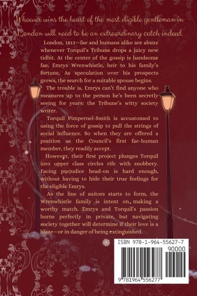 Whoever wins the heart of the most eligible gentleman in London will need to be an extraordinary catch indeed. London, 1813-fae and humans alike are abuzz whenever Torquil's Tribune drops a juicy new tidbit. At the center of the gossip is handsome fae, Emrys Wrenwhistle, heir to his family's fortune. As speculation over his prospects grows, the search for a suitable spouse begins. The trouble is, Emrys can't find anyone who measures up to the person he's been secretly seeing for years: the Tribune's witty society writer. Torquil Pimpernel-Smith is accustomed to using the force of gossip to pull the strings of social influence. So when they are offered a position as the Council's first fae-human member, they readily accept. However, their first project plunges Torquil into upper class circles rife with snobbery. Facing prejudice head-on is hard enough, without having to hide their true feelings for the eligible Emrys. As the line of suitors starts to form, the Wrenwhistle family is intent on making a worthy match. Emrys and Torquil's passion burns perfectly in private, but navigating society together will determine if their love is a blaze-or in danger of being extinguished.