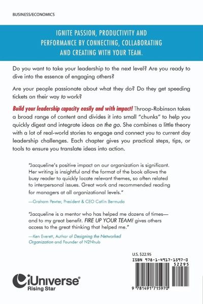 In today's ever-changing world, leaders must create anew every day-new solutions, new ideas for action, new strategies - and then comfortably lead their organizations into an unpredictable future. In her handbook for leaders, author Jacqueline Throop-Robinson provides tools and techniques that can help any CEO or manager ignite passion, productivity and performance by connecting, collaborating and creating with their team. Throop-Robinson relies on her extensive experience as a successful entrepreneur, corporate manager, and consultant to help empower leaders and their teams to achieve their full potential. While combining theory with real-life stories and activities, Throop-Robinson offers time-tested advice that helps leaders change their mindset to build trust; collaborate and play with their team to accelerate performance; explore the importance and impact of inspiration; use feedback and feedforward to improve leadership practices and overall productivity; and lead fearlessly to help teams overcome obstacles and see progress. Fire Up Your Team shares fifty ways to lead fearlessly, strengthen skills, improve creativity, and motivate a team to effectively move forward and achieve goals, one step at a time.