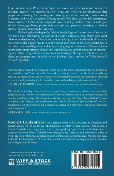 Fire, Water, and Wind explores the forming of a healthy sense of personal identity. The impetus for Fire, Water, and Wind was the observation that people are searching for meaning and identity, are dissatisfied with their current situations, and many are actively seeking escape from their current life experiences. This is evidenced by the number of people involved in high-risk activities, be it drug or alcohol abuse, gambling, prostitution, multiple sex partners, smoking, or violent crimes. But does it have to be this way? Following the finding in the fields of psychology and neuroscience that narrative plays a key role within the context of identity formation, Fire, Water, and Wind offers an understanding of identity formation that is grounded in the biblical narrative that enables and equips one to face the varied challenges of life. Concluding that a narrative understanding of ones identity and ongoing formation as a follower of Jesus incorporates an integration of heart and mind, body, and soul, that requires the nurturing of a biblical imagination and unconscious, looking at the signs, symbols, and metaphors, encouraging ones life wholly alive. Enabling one to answer the ""What should I live for?"" question.