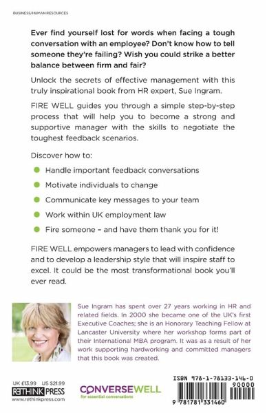 Ever find yourself lost for words when facing a tough conversation with an employee? Don't know how to tell someone they're failing? Wish you could strike a better balance between firm and fair? Unlock the secrets of effective management with this truly inspirational book from HR expert, Sue Ingram. FIRE WELL guides you through a simple step-by-step process that will help you to become a strong and supportive manager with the skills to negotiate the toughest feedback scenarios. Discover how to: Handle important feedback conversations; Motivate individuals to change; Communicate key messages to your team; Work within UK employment law; Fire someone - and have them thank you for it! FIRE WELL empowers managers to lead with confidence and to develop a leadership style that will inspire staff to excel. It could be the most transformational book you'll ever read.
