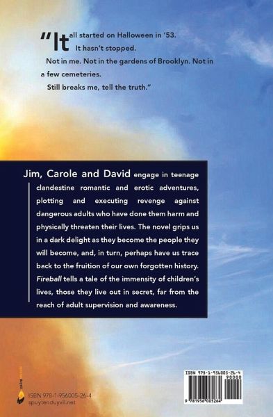 Jim, Carole and David engage in teenage clandestine romantic and erotic adventures, plotting and executing revenge against dangerous adults who have done them harm and physically threaten their lives. The novel grips us in a dark delight as they become the people they will become, and, in turn, perhaps have us trace back to the fruition of our own forgotten history. Fireball tells a tale of the immensity of children's lives, those they live out in secret, far from the reach of adult supervision and awareness.